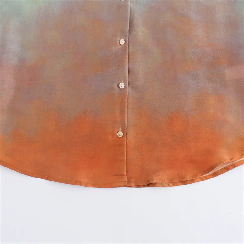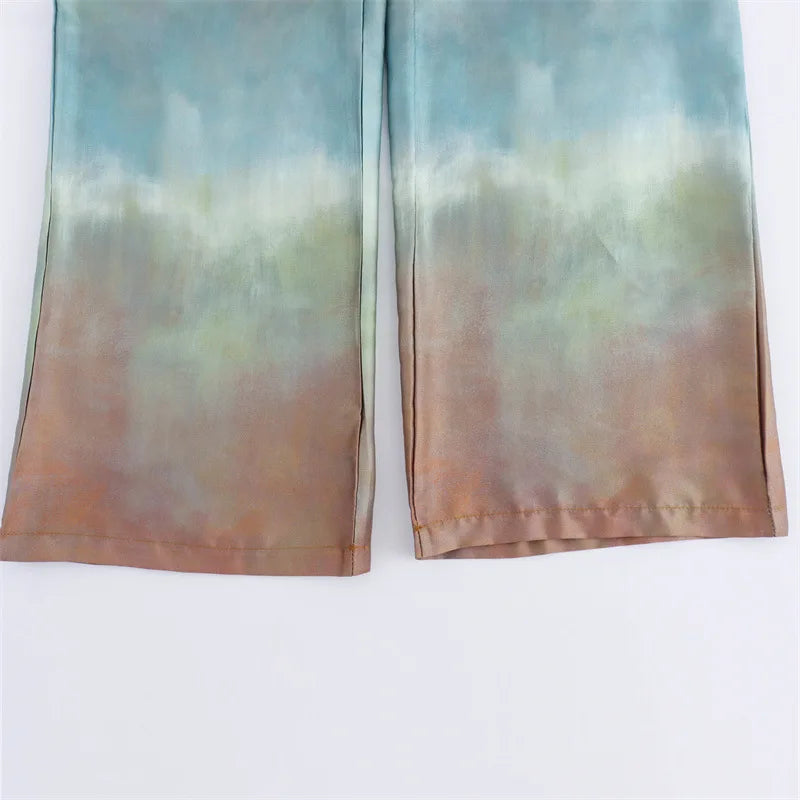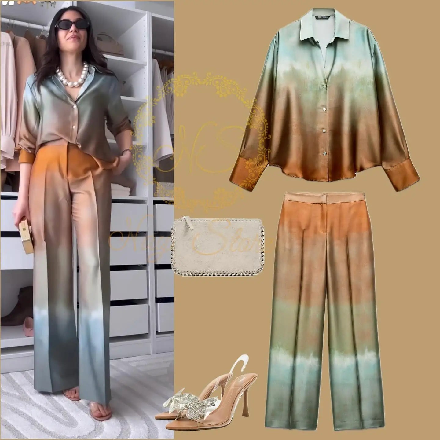 Tie Dye Gradient Print Loose Shirts Top Wide Leg Pants Sets New Autumn Button Blouse Long Trouser Satin Vintage Chic Women Suit